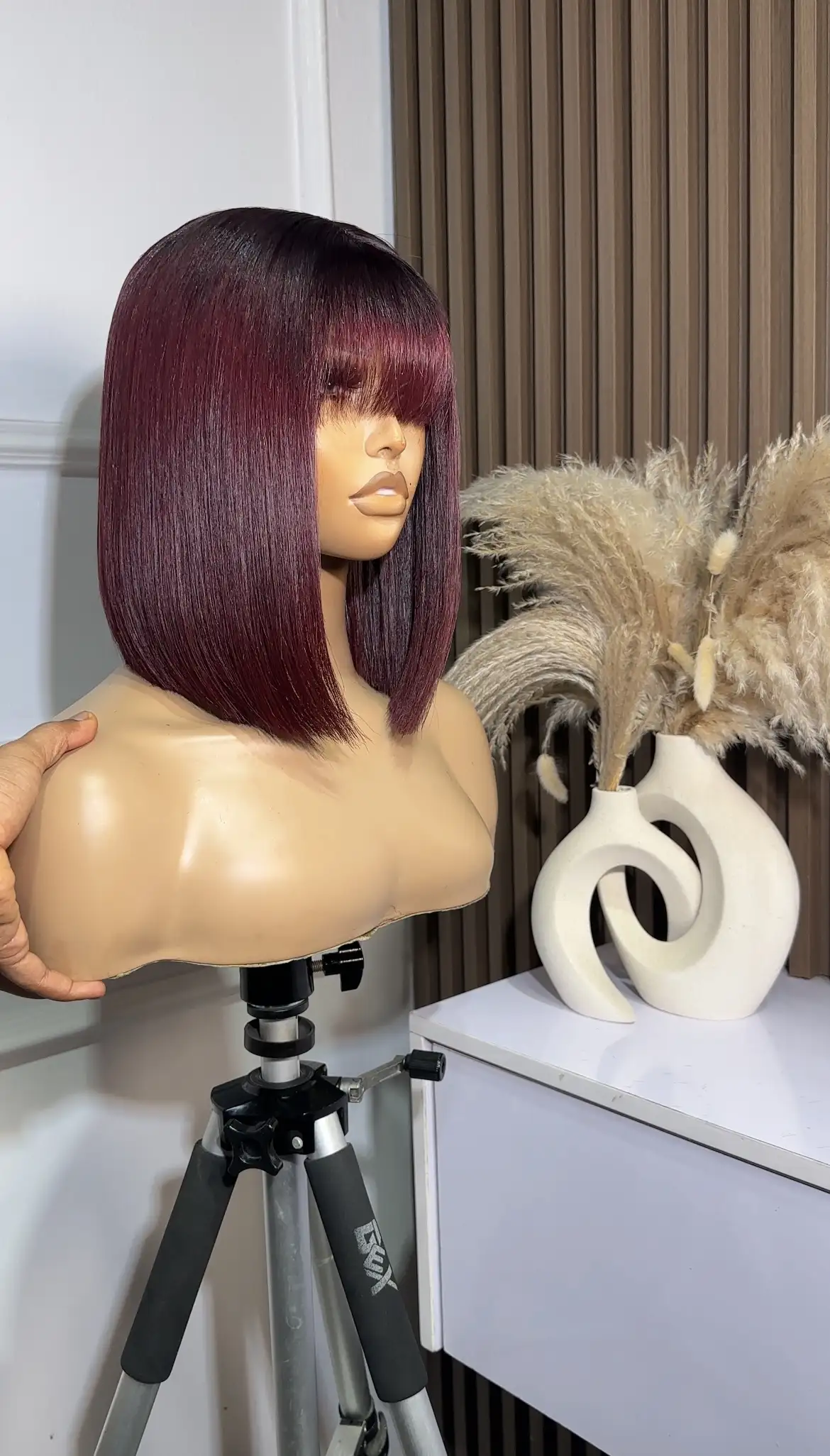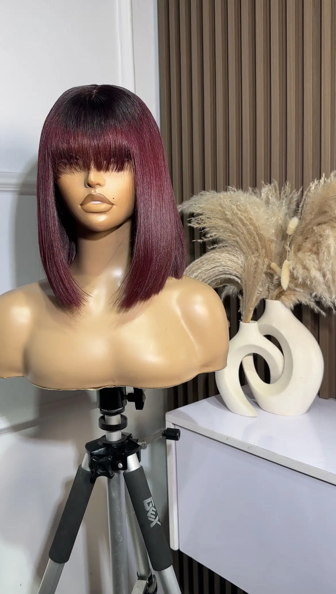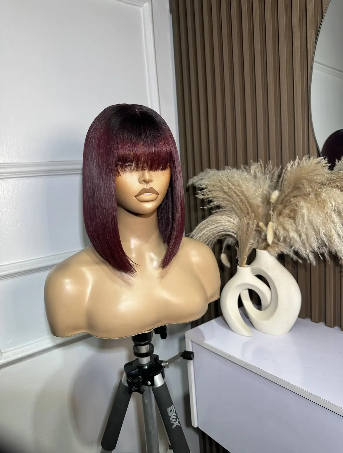 10” Single Baby Donor Burgundy Closure Fringe Wig Paired With A 2By6 Closure.