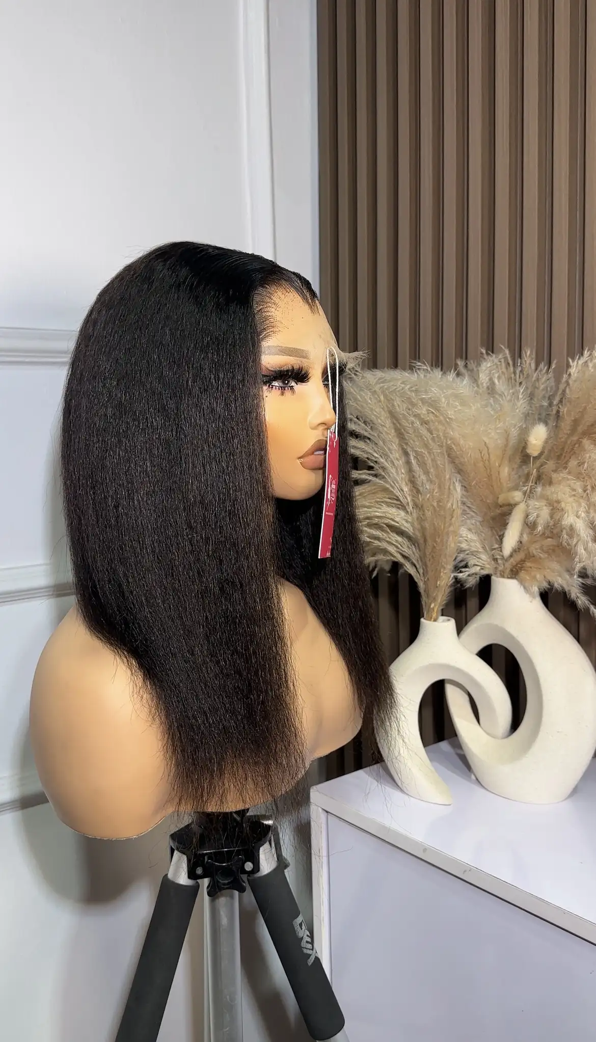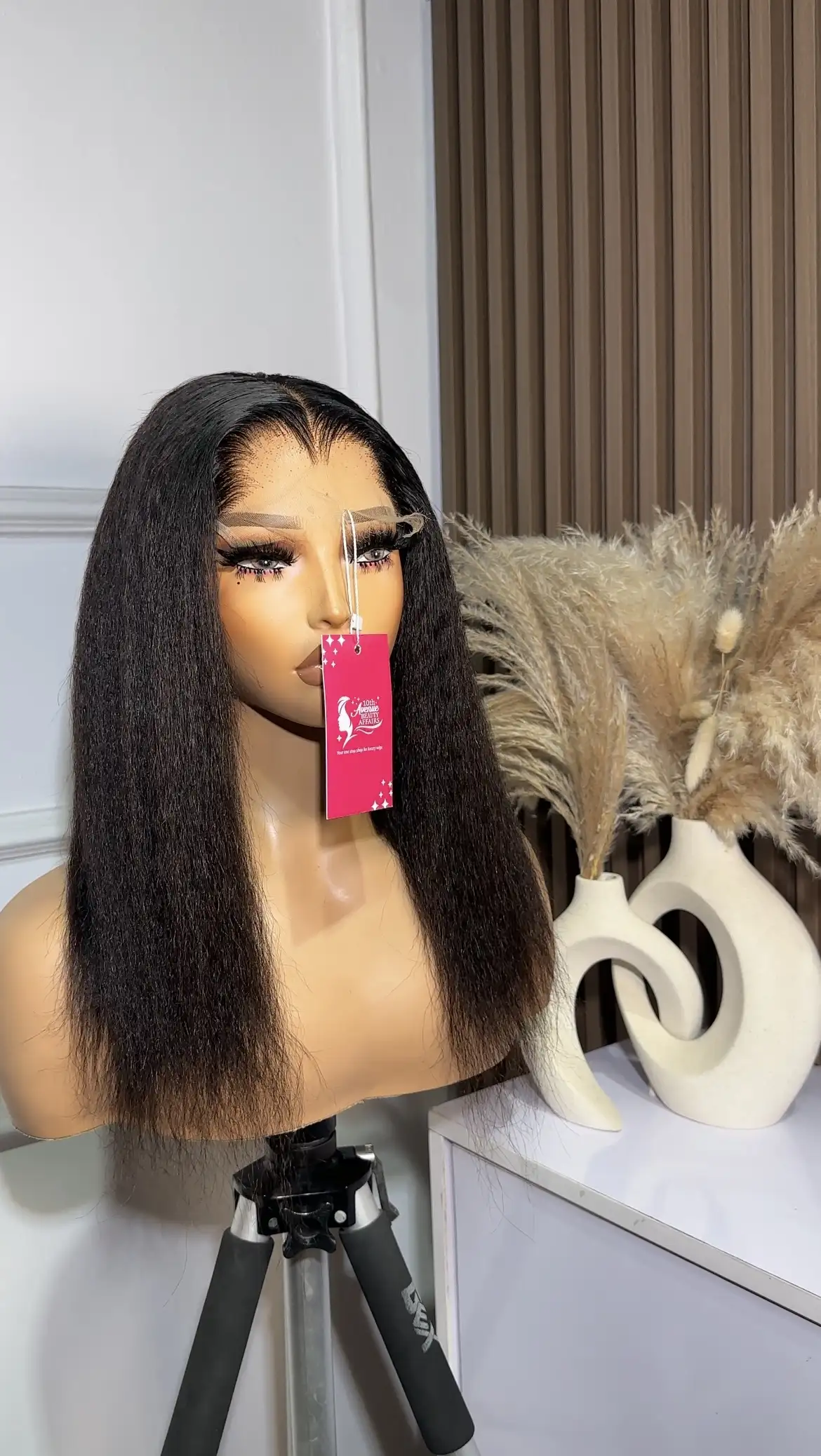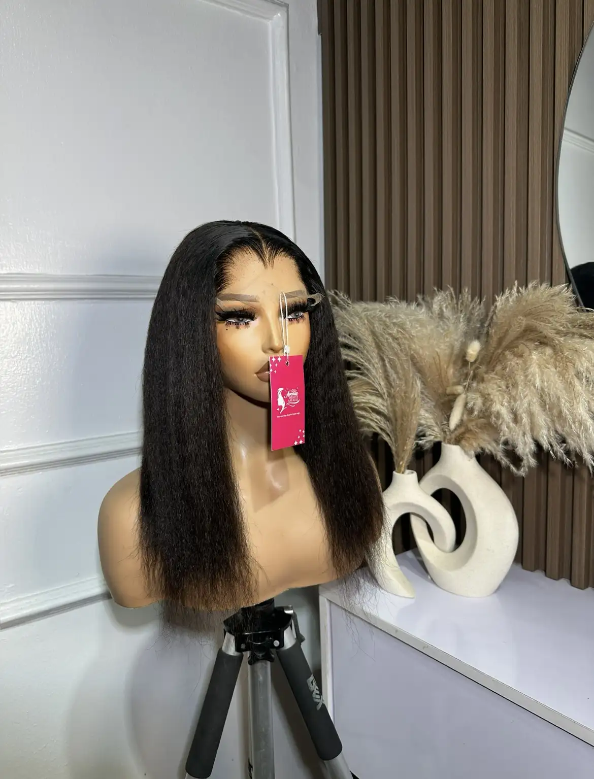 12” Kinky straight paired with a 5 by 5 HD closure. Lace plucked to be Lagos hairline.