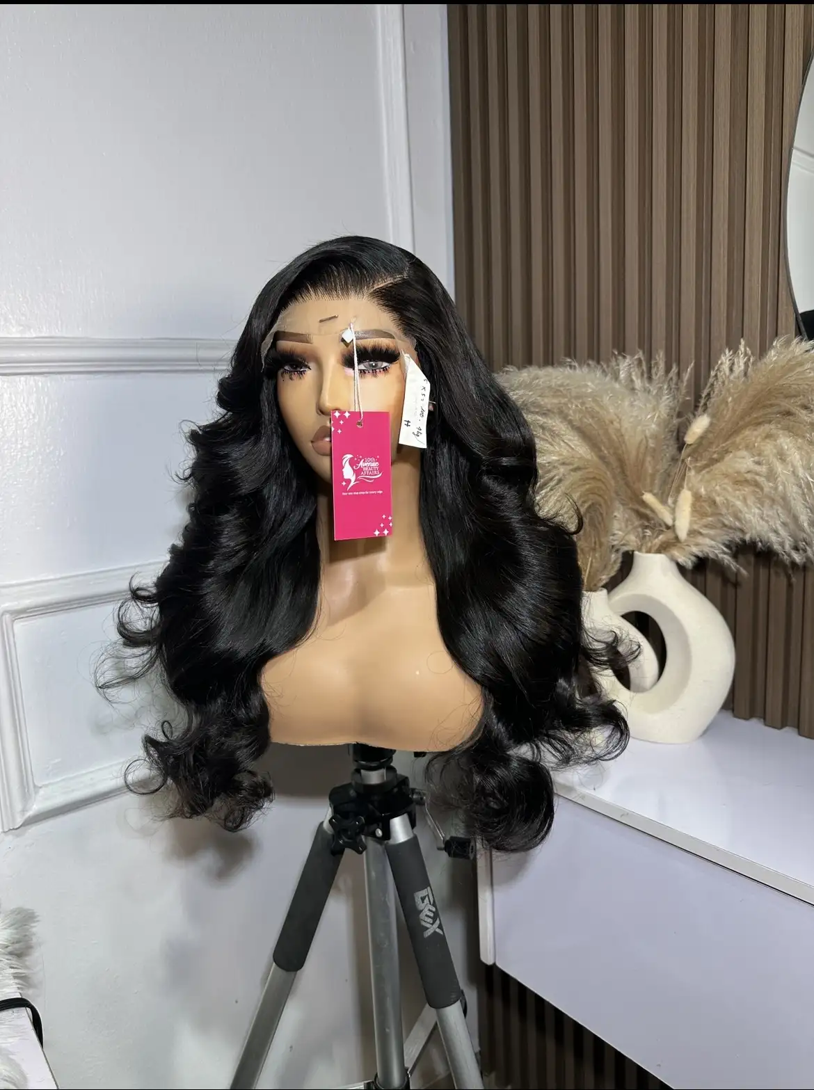 20” Wavy Layered Black wig paired with a 5 by 5 closure.