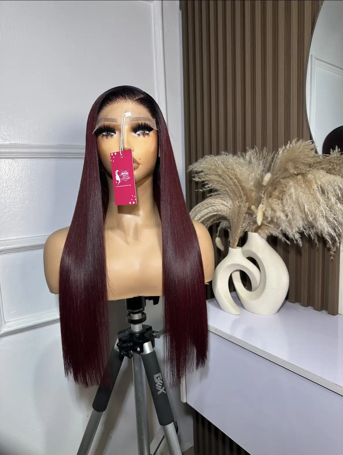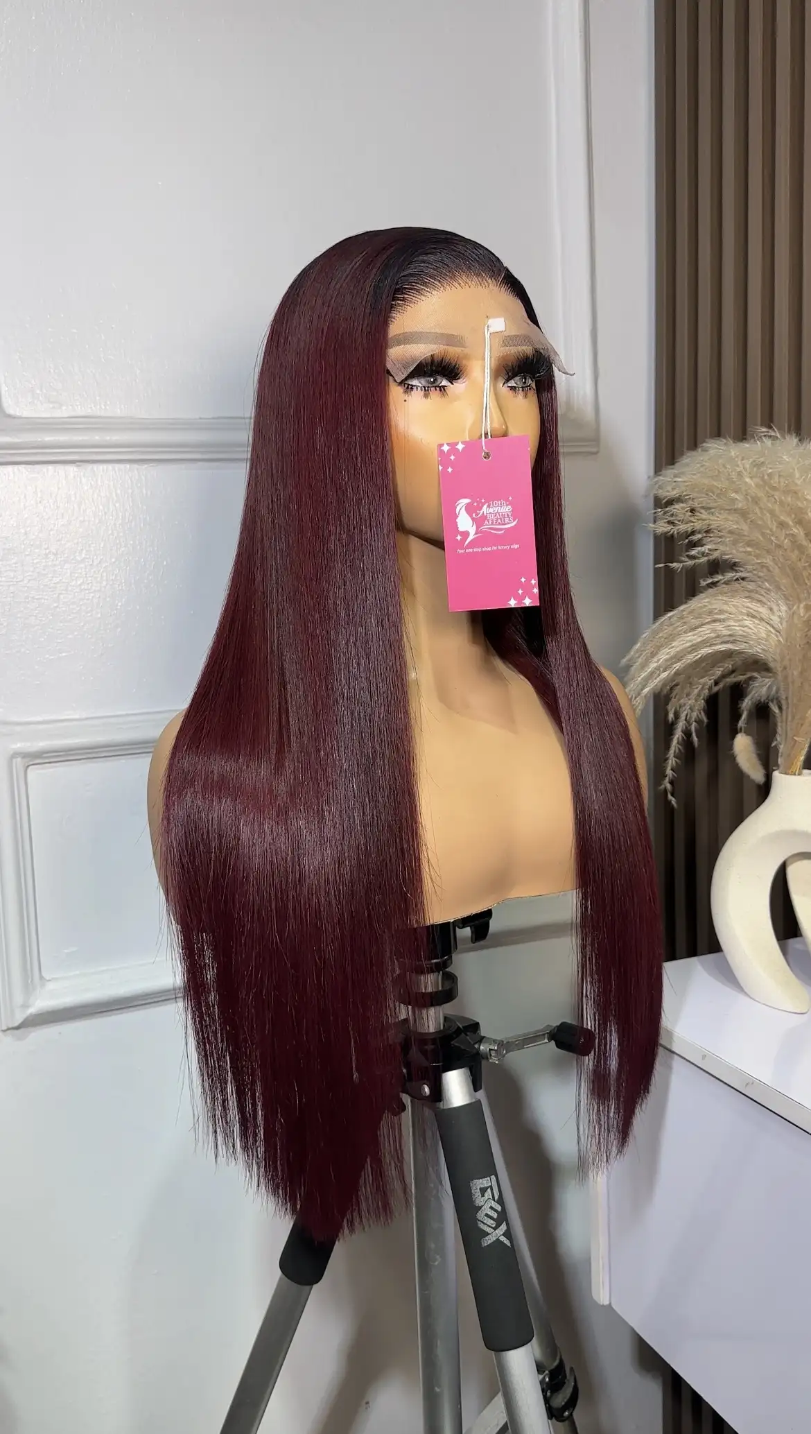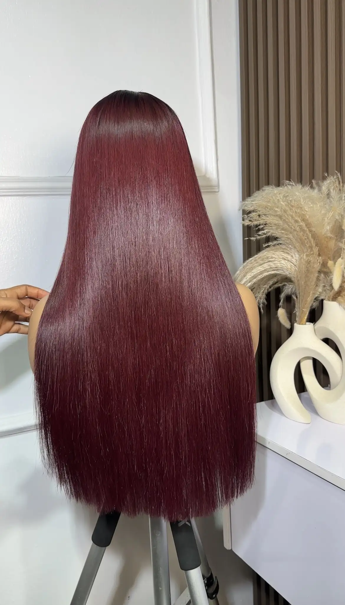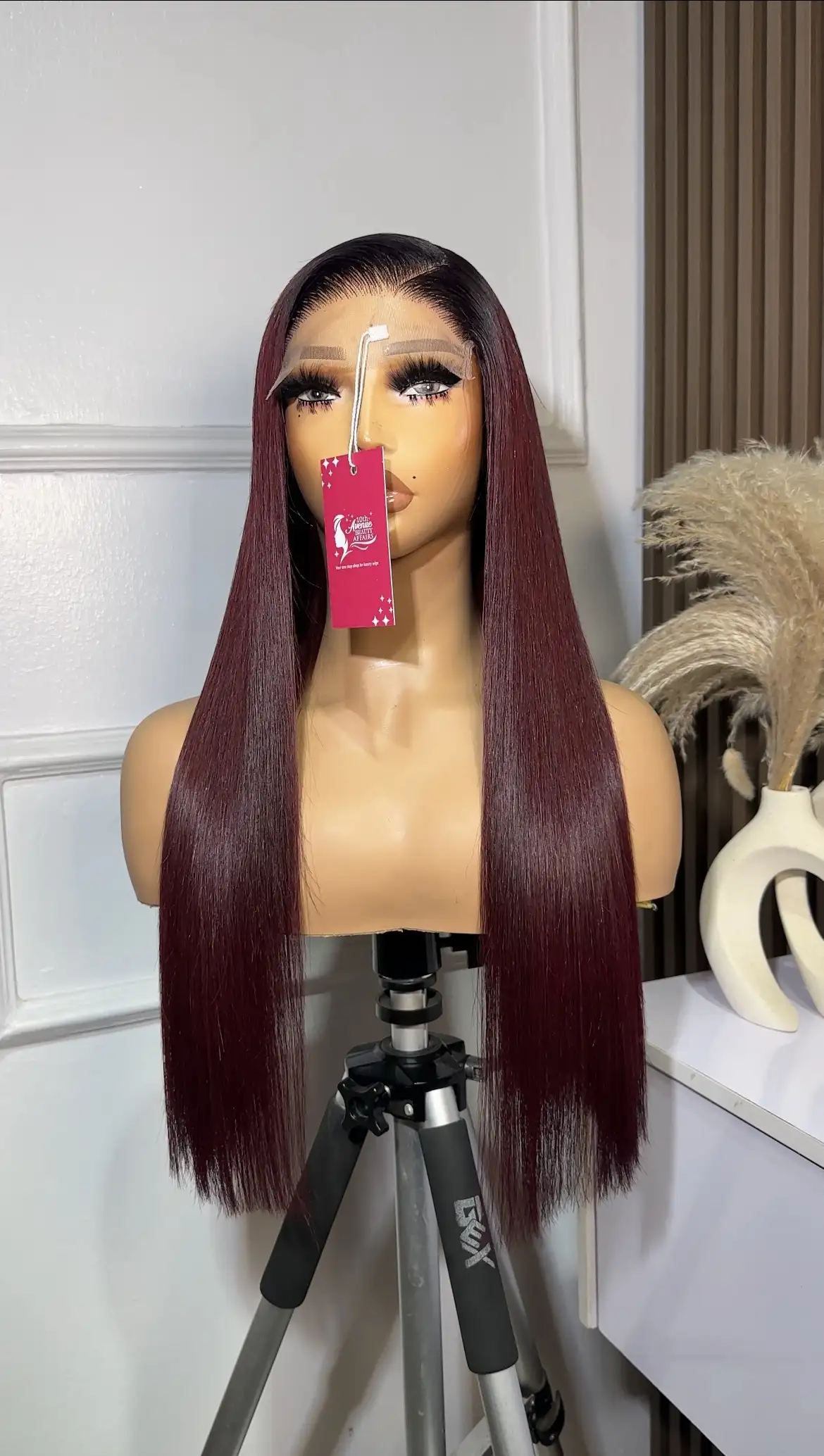 22” Raw Baby thin Burgundy colored wig, paired with a 5 by 5 closure. Thick and silky.