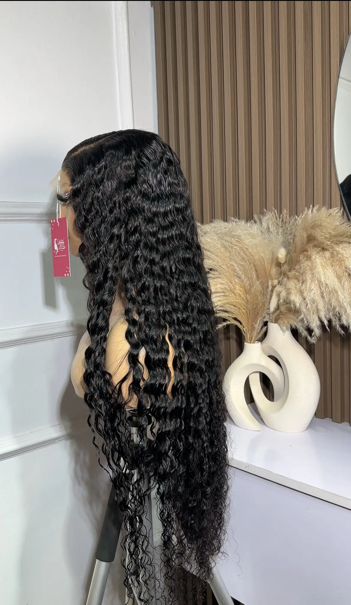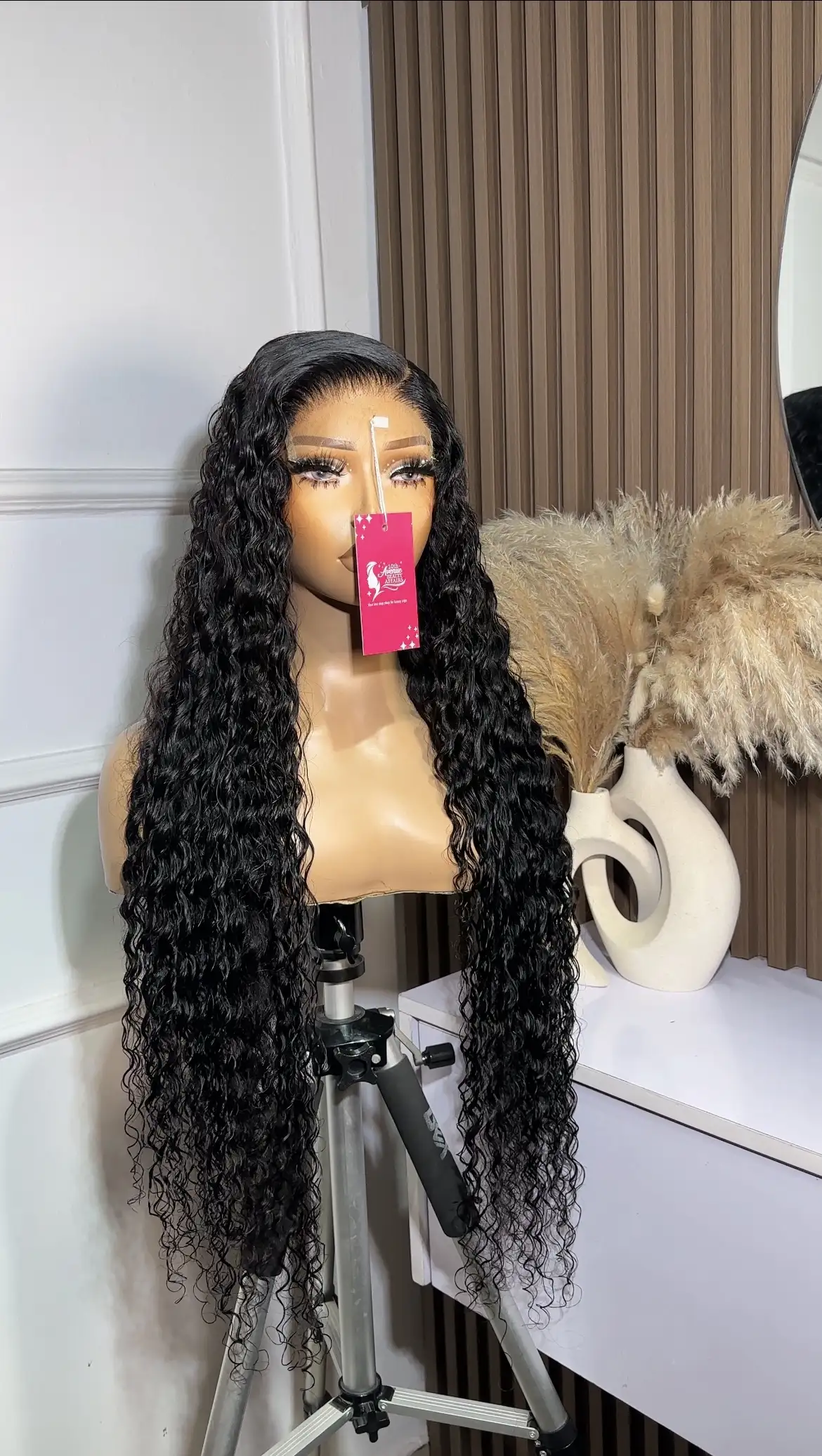 30” Black Deepwave wig paired with a 5 by 5 Swice lace.