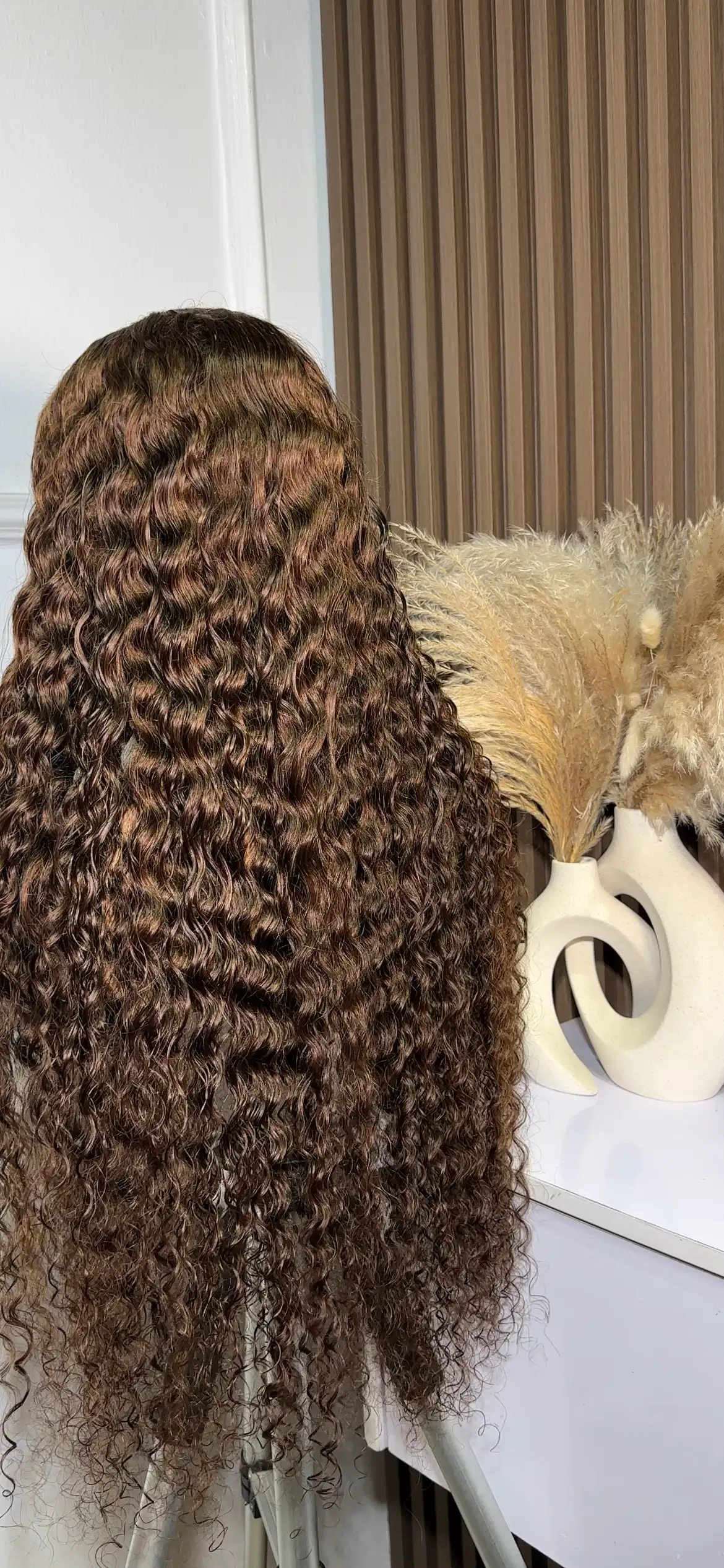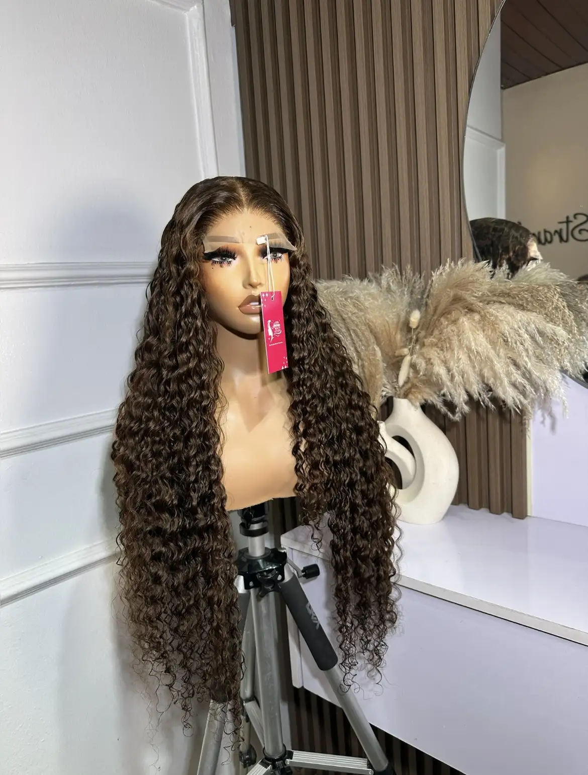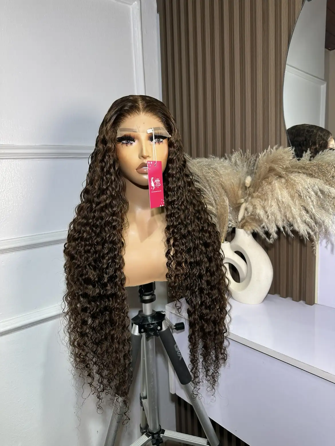 30” Brown Deepwave wig paired with a 5 by 5 HD lace.