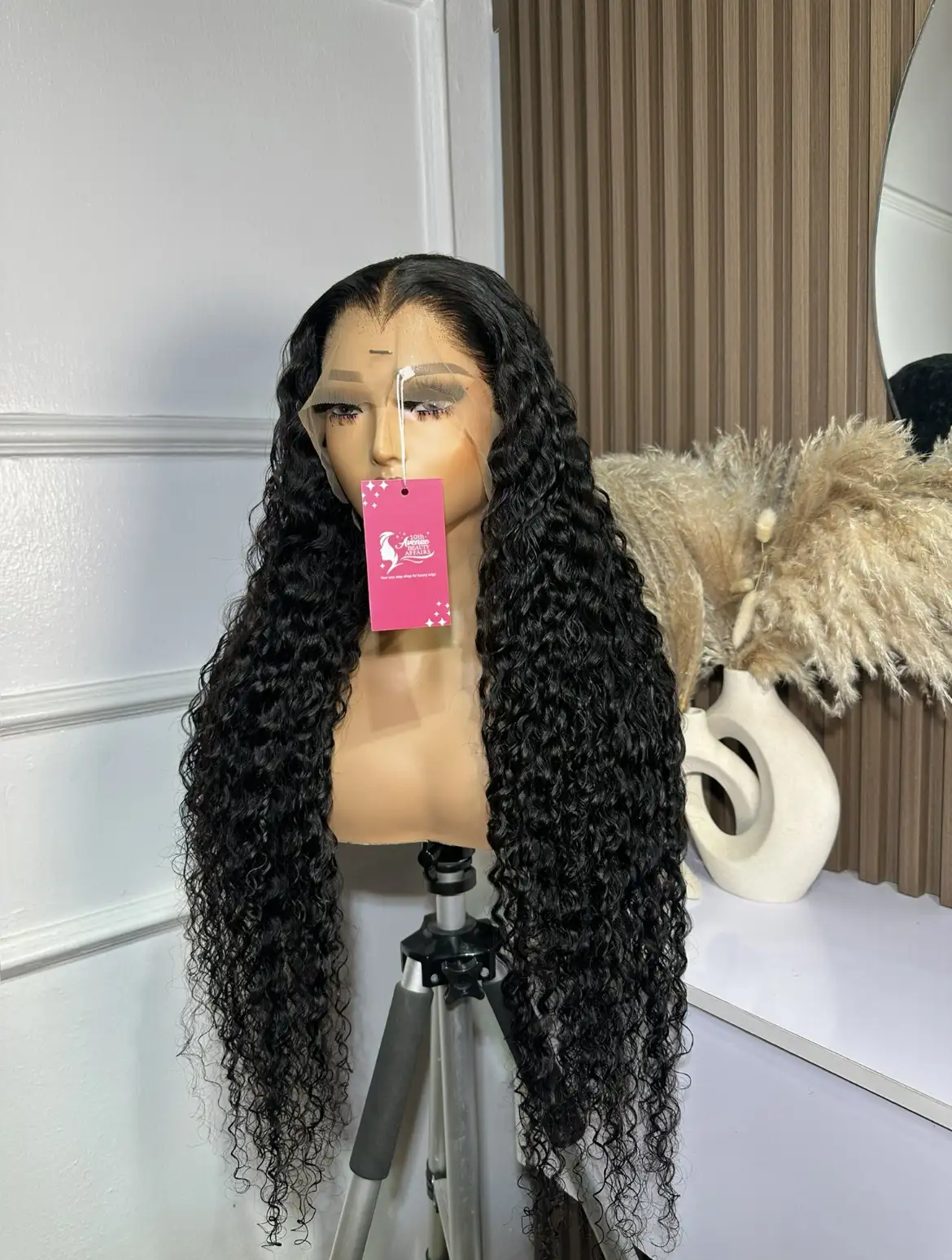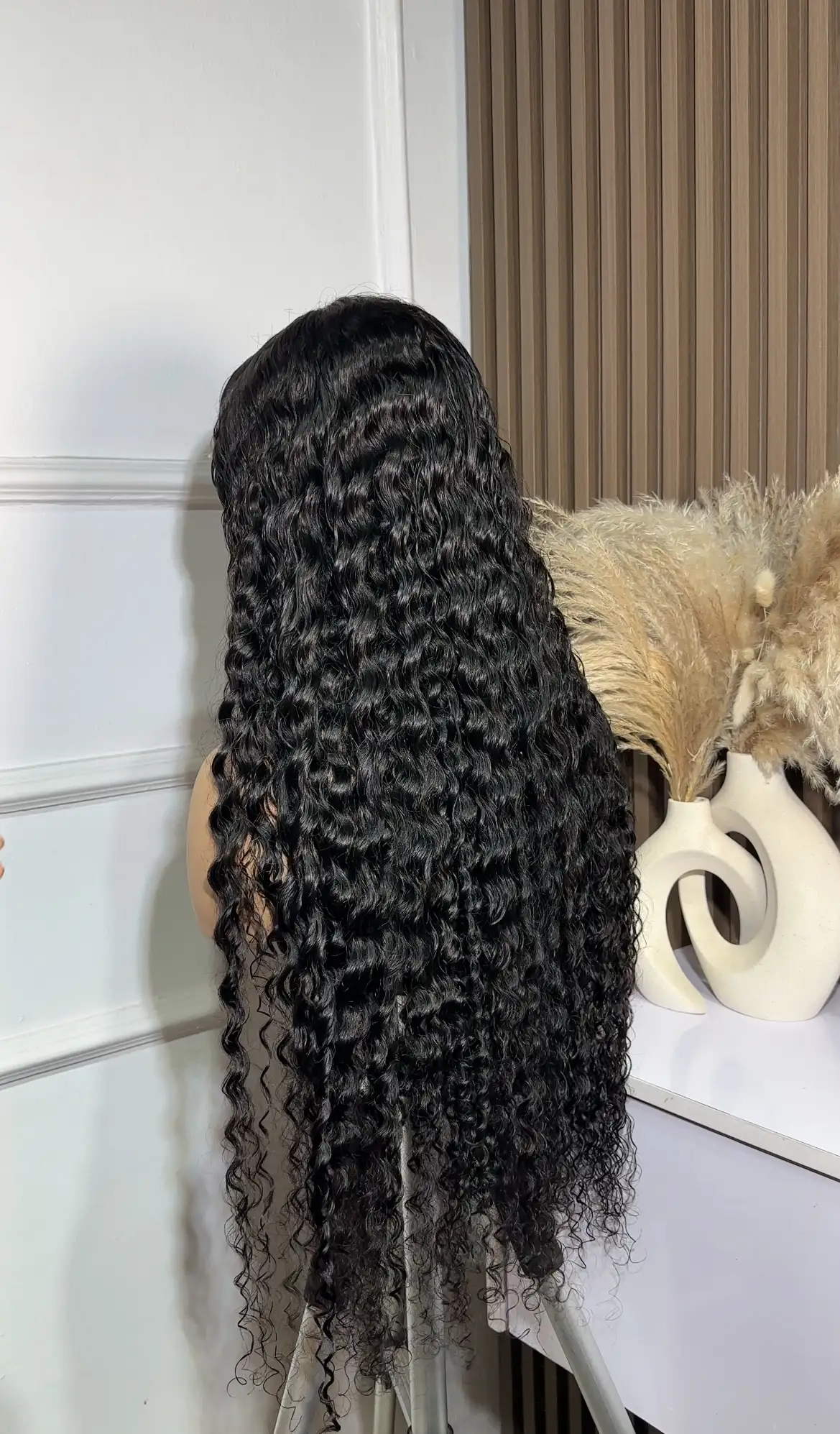 30” Single donor raw black deepwave wig paired with a 13 by 6 Swice lace.